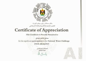 حصل المبتكر صادق فاضل صادق التميمي على شهادة اشتراك من مجلس الوزراء العراقي على مشروعه الذي قدمه للمجلس تحت اسم،، نظام الصيانة التنبؤية لشبكات المياه ،، ضمن مسابقة الابتكار التي أطلقها مكتب الذكاء الاصطناعي التابع لمجلس الوزراء.