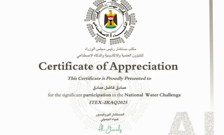 حصل المبتكر صادق فاضل صادق التميمي على شهادة اشتراك من مجلس الوزراء العراقي على مشروعه الذي قدمه للمجلس تحت اسم،، نظام الصيانة التنبؤية لشبكات المياه ،، ضمن مسابقة الابتكار التي أطلقها مكتب الذكاء الاصطناعي التابع لمجلس الوزراء.